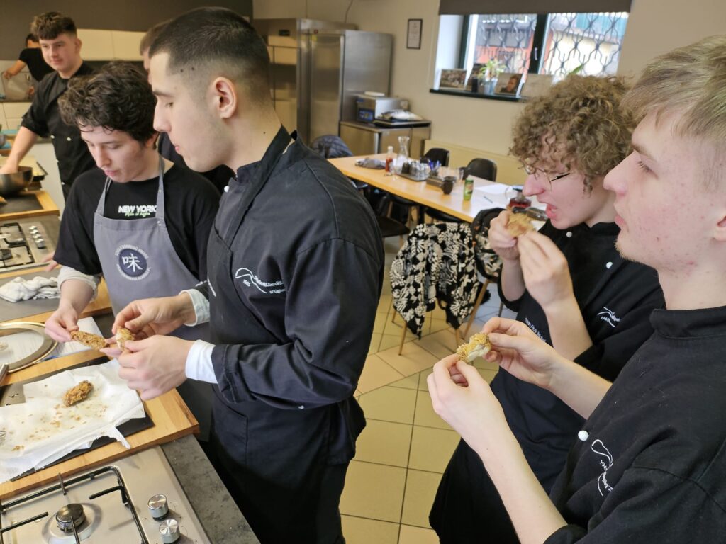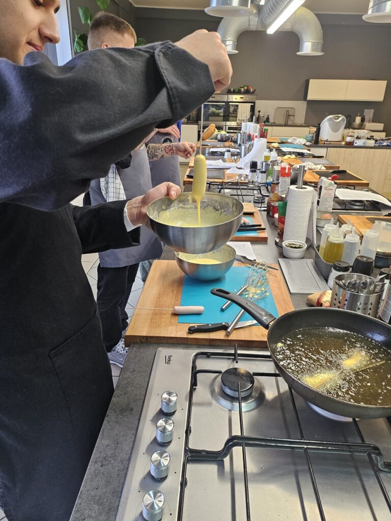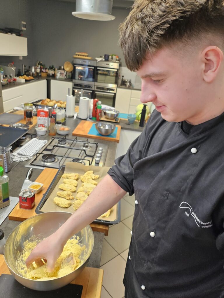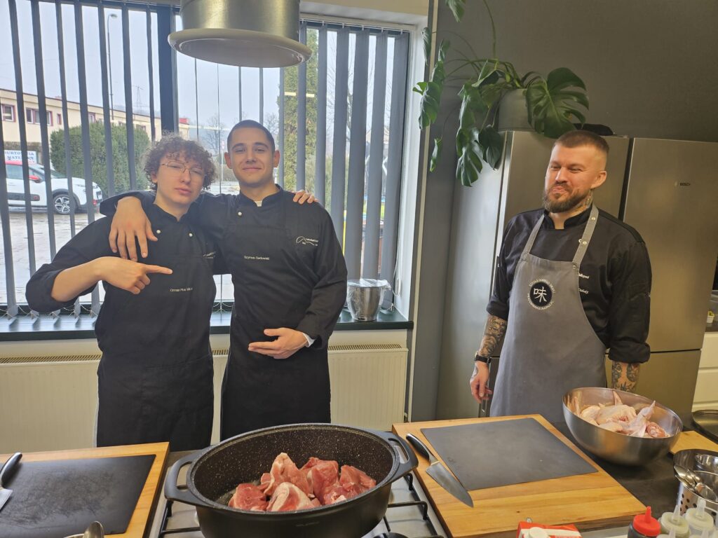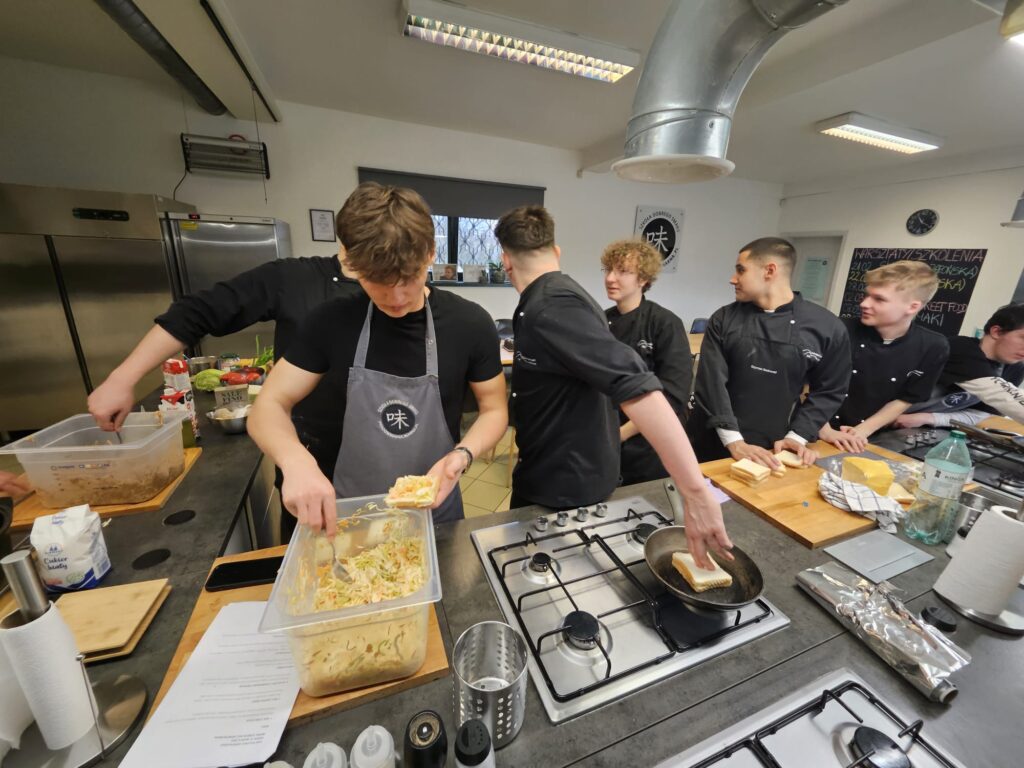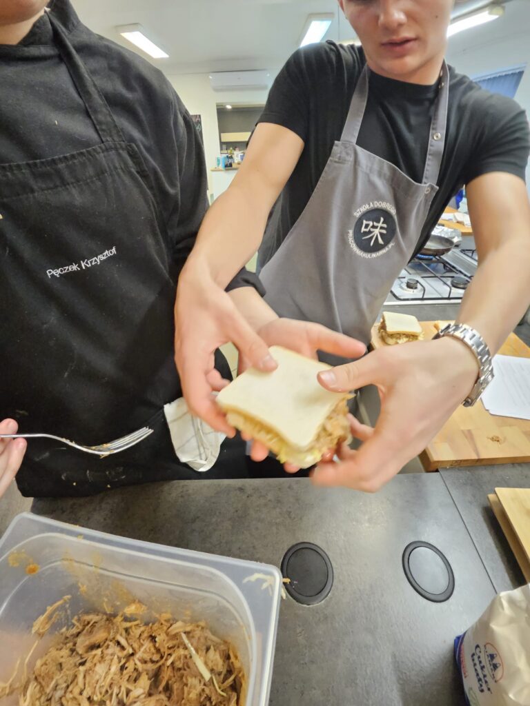 Uczniowie z klasy III TG w dniu 01.03.2025 szkolili się na trzecim już kursie w ramach projektu „Regionalna gastronomia dla Dolnego Śląska”. Kurs „Kuchnia amerykańska” przeprowadzony był przez wspaniałego mistrza Pana Bartosza Dębskiego. Przygotowano następujące potrawy: