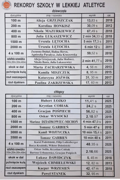 Tabela rekordów szkoły w lekkiej atletyce stan na październik 2025 r.